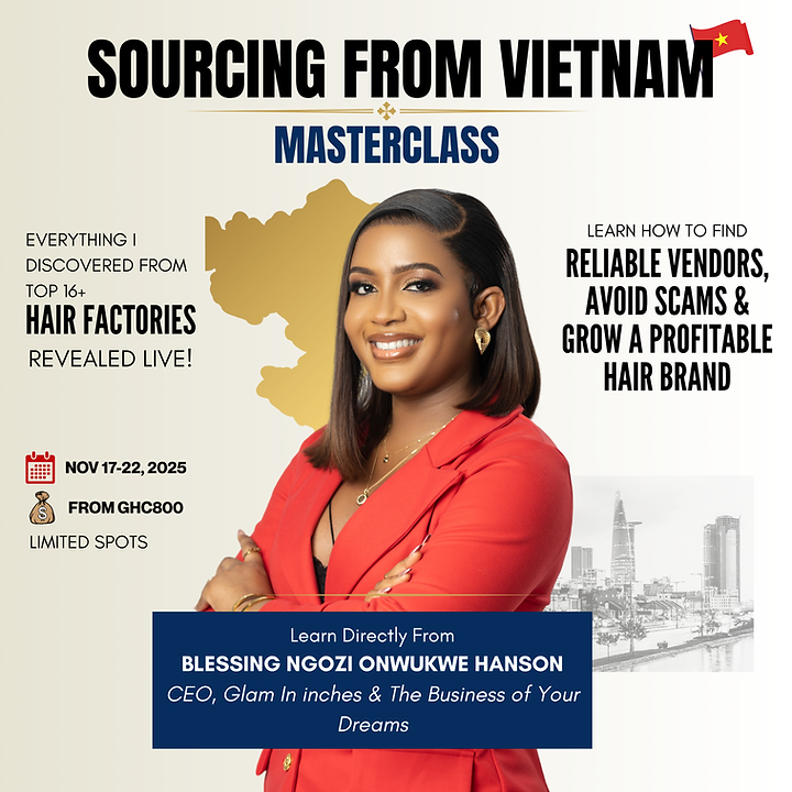 Every hair vendor looks good online — until you lose customers, money, and credibility because of poor-quality shipments you didn’t see coming. After personally visiting 16 factories across Vietnam, I uncovered the hidden truths behind the hair industry — why some vendors start strong but fall off, how to truly test hair quality before buying in bulk, and how to protect your brand’s reputation (and profits) for good. Inside this 5-day Sourcing from Vietnam Masterclass, I’ll guide you step-by-step through the exact systems I used to rebuild my business and master sourcing without flying across the world. You’ll learn: 🔹 How to identify real vs. fake vendors (beyond what they show online) 🔹 My full sample testing checklist and pricing system 🔹 The quality differences between Vietnam, China & India — and who to trust for what 🔹 How to scale sustainably with multiple reliable suppliers 💬 If you’ve ever wasted money on bad vendors or inconsistent batches, this is your sign to stop guessing and start sourcing smart. 🎓 Choose Your Access Level 💡 OPTION 1: Masterclass Only (GHC 800/ $74/ 106,000 naira) What you get: ✔️ Access to the 5-Day Sourcing from Vietnam Masterclass (Nov 17–22, 2025) ✔️ Learn directly from Blessing Ngozi Onwukwe Hanson, CEO of Glam In Inches & TBD ✔️ Practical sourcing lessons from 16+ real Vietnamese factories ✔️ Access to live Q&A sessions during the Masterclass week ✔️ Digital workbook with vendor red-flags checklist ✔️ Replay access for 14 days 🌟 OPTION 2: Full Access Bundle (GHC 3,000/ $275/ 398,000 naira) What you get: ✅ Everything in the Masterclass Only package PLUS: ➕ Lifetime access to the Notes from Vietnam full course (4 modules) ➕ Access to Blessing’s Trusted Vendor List (Vietnam, China, India & Ghana) ➕ Templates: Price & Profit Calculator + Sample Testing Tracker ➕ 1-on-1 Business Audit & Strategy Session (30 mins) ➕ Priority WhatsApp/Email support for 2 weeks ➕ Certificate of Completion 📅 Next Cohort: 20th - 26th November 2025 🚪 Registration closes: 18th November (Limited seats available) 📲 Secure your spot today and stop guessing your way through the hair business.